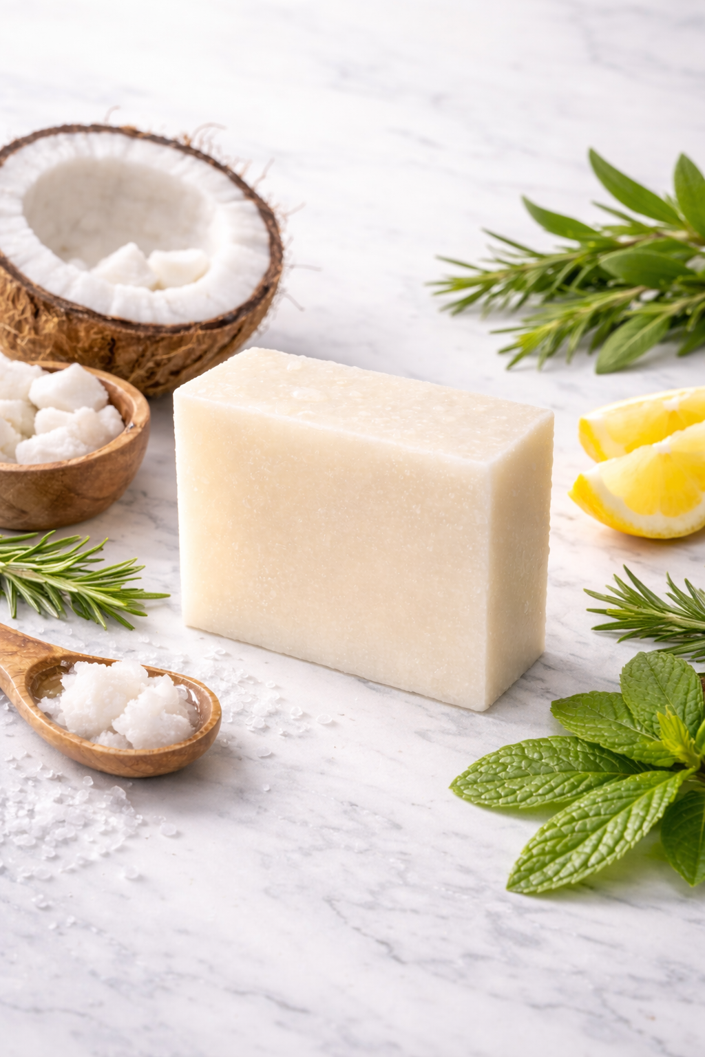 Cocos Nucifera (Coconut) Oil, Aqua, Sodium Hydroxide, Rosmarinus Officinalis (Rosemary) Oil, Citrus Limon (Lemon) Peel Oil, Melaleuca Alternifolia (Tea Tree) Leaf Oil.
